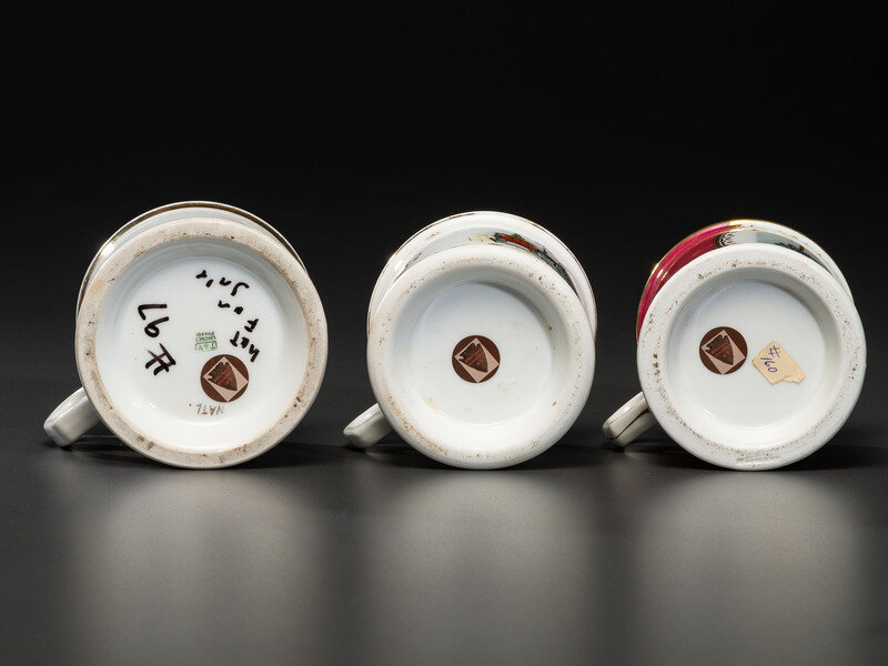 comprising a mug depicting a man in his shop identified J.R. Millar, and two mugs depicting machines identified W.F. Emmett and A.L. Drake.