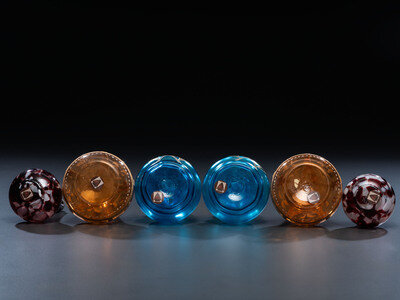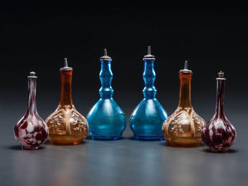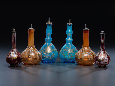 Six Enameled and Gilt Glass Barber Bottles