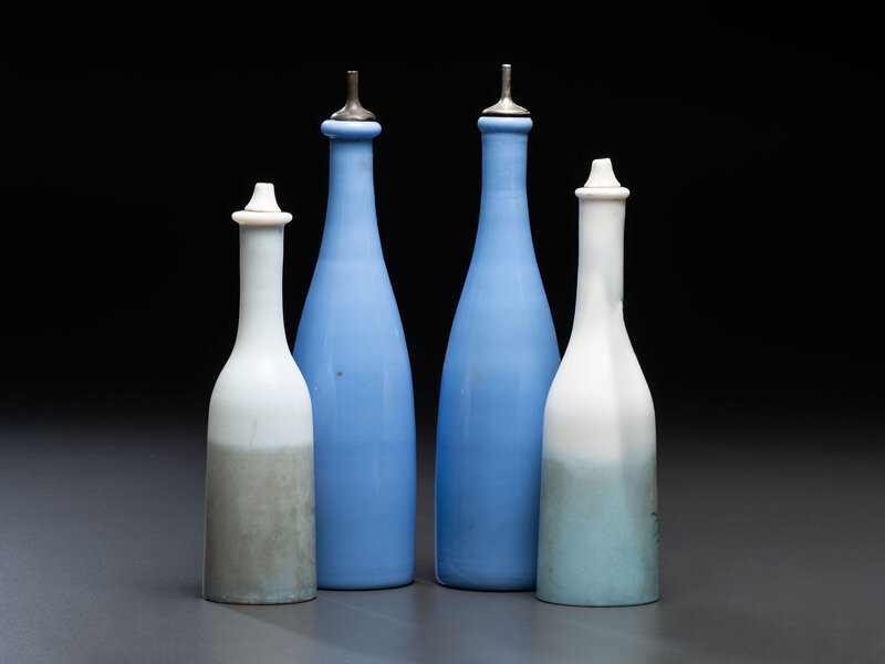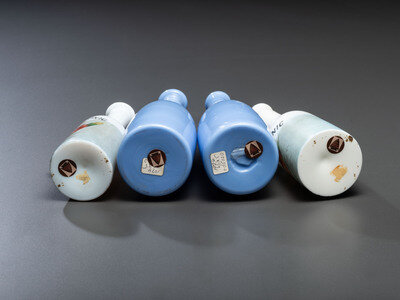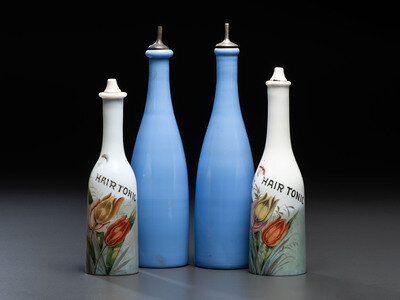 including two hand-painted milk glass bottles labeled Hair Tonic.