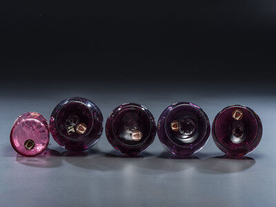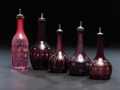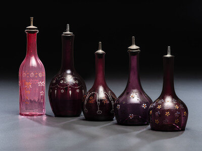 Five Enameled Glass Barber Bottles