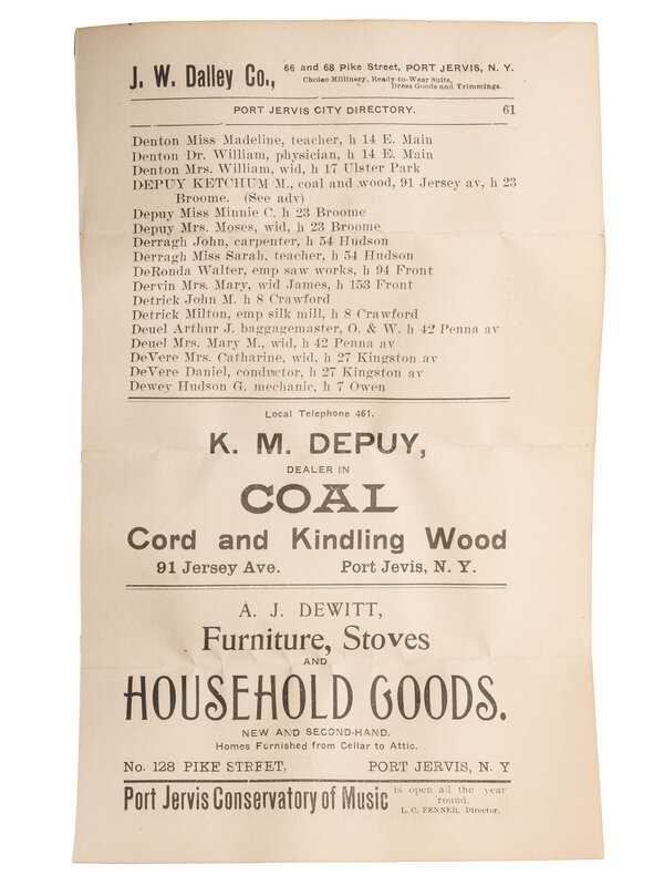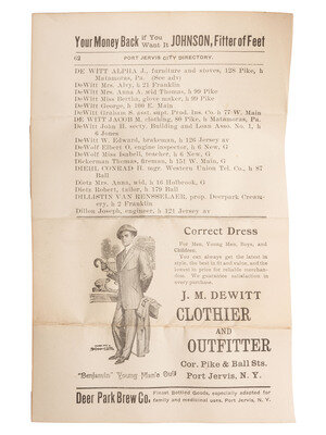 together with an original paper advertisement for J.M. Dewitt, Clothier and Outfitter, Port Jervis, N.Y.