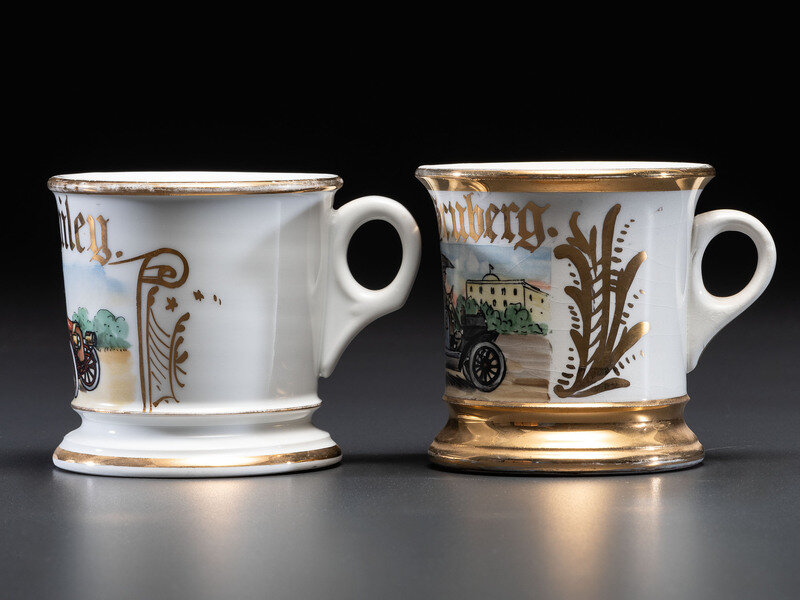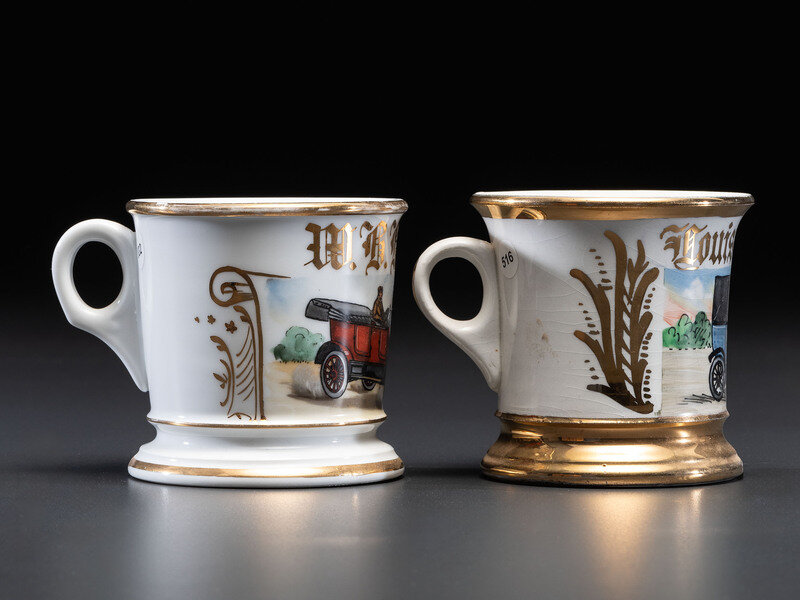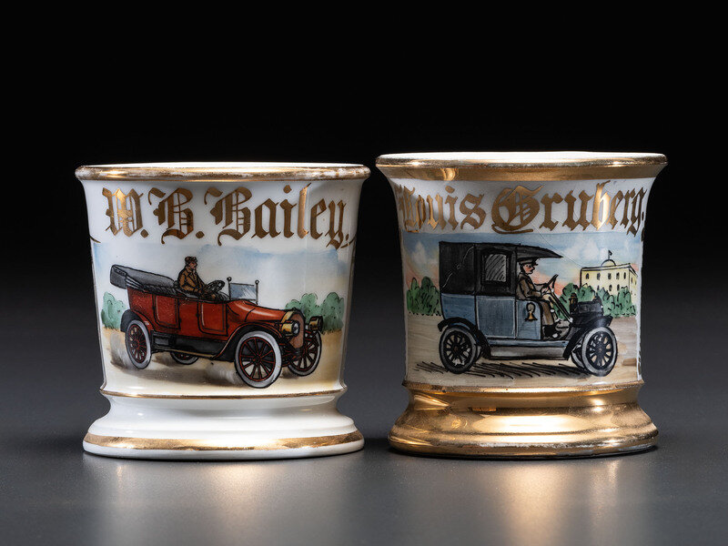 Two Porcelain Shaving Mugs with Automobiles