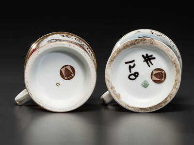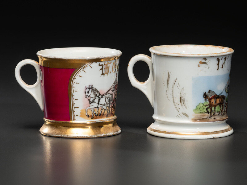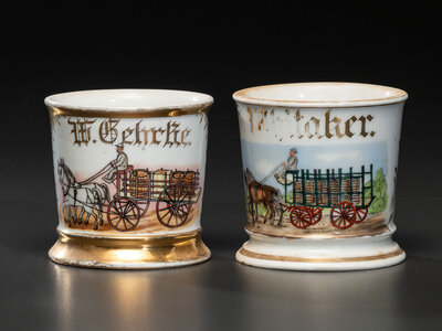 Two Occupational Shaving Mugs Depicting Horse-Drawn Barrel Wagons