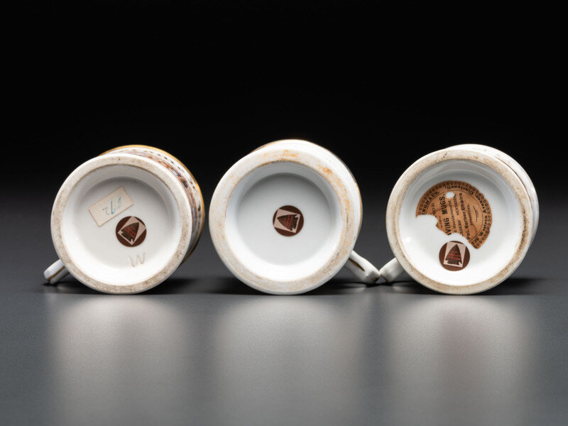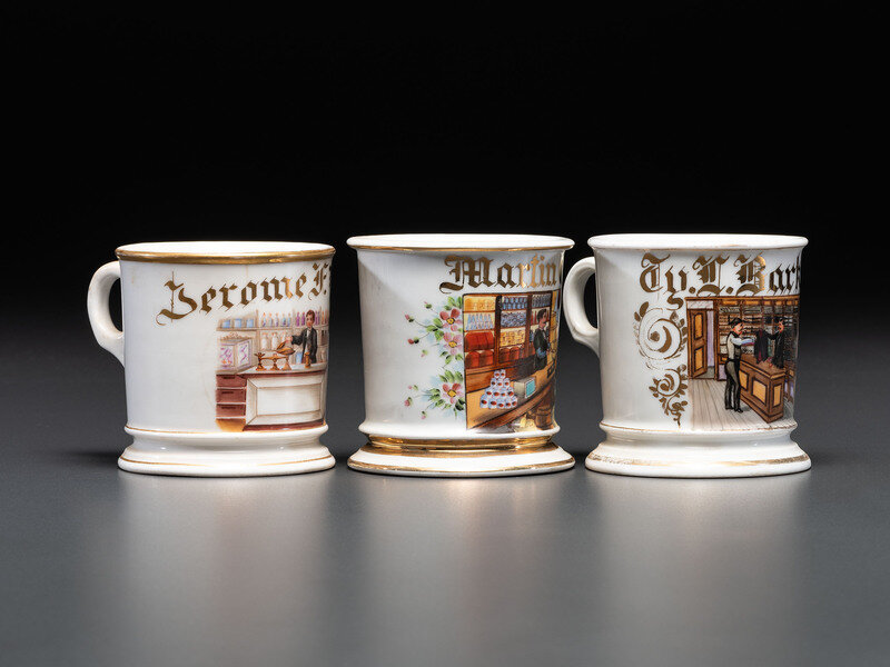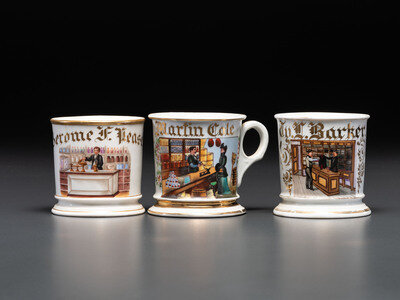 including a tailor's mug identified Ty. L. Barker and with a partial paper label to underside, a pharmacist's mug identified Jerome F. Pease, and a grocer's mug identified Martin Cole.