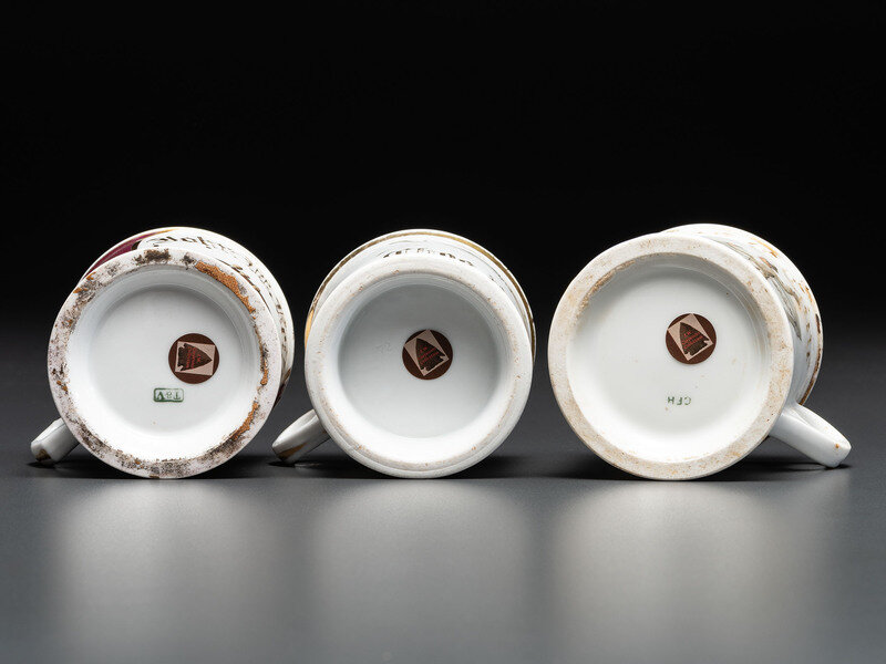 including a mug depicting a knife with the name Chas. W. Booth, a stone carver's mug identified C.C. Cline set against a fuschia wrap, and a carpenter's mug identified John M. Reilly.