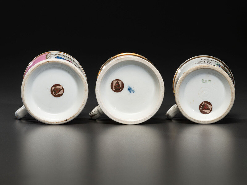 comprising a mug identified Conrad Dillery with two flags and a crest against a pink wrap, a mug identified Geo. Polites depicting a compote of fruit, and a mug depicting three women in robes with the name R.F. Gill.