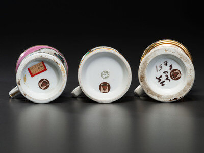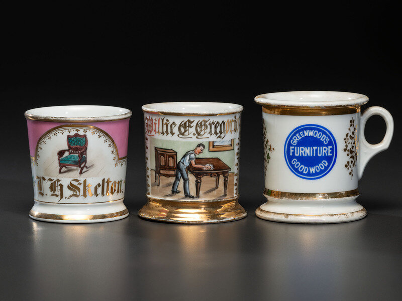comprising one mug identified Willie G. Gregorio with a green wrap and depicting a man polishing a table, one identified Greenwood's Goodwood Furniture, and one identified T.H. Skelton and depicting a chair set against a pink wrap.