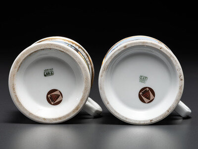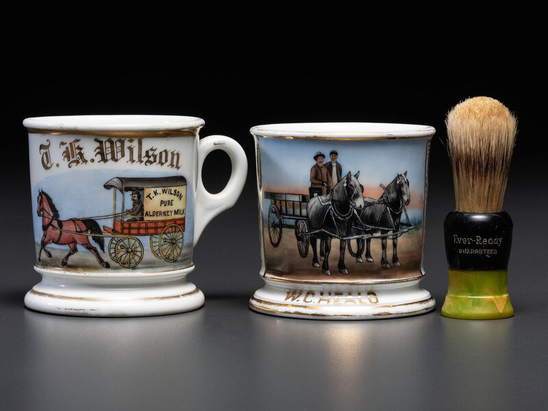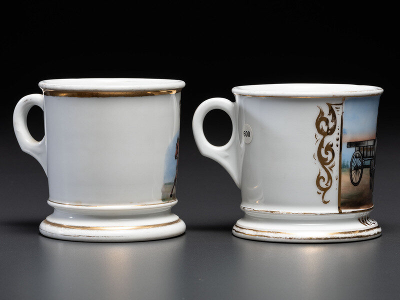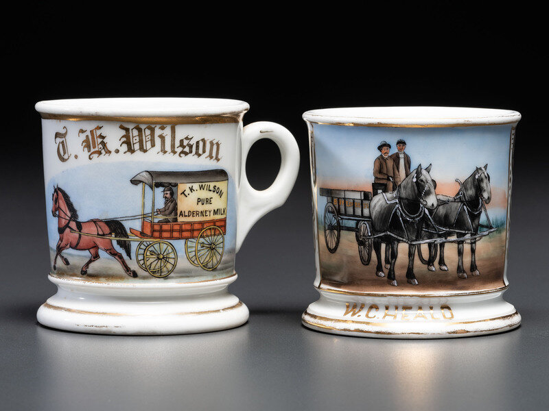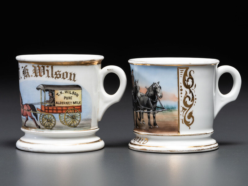 Two Porcelain Occupational Shaving Mugs with Horse-Drawn Wagons