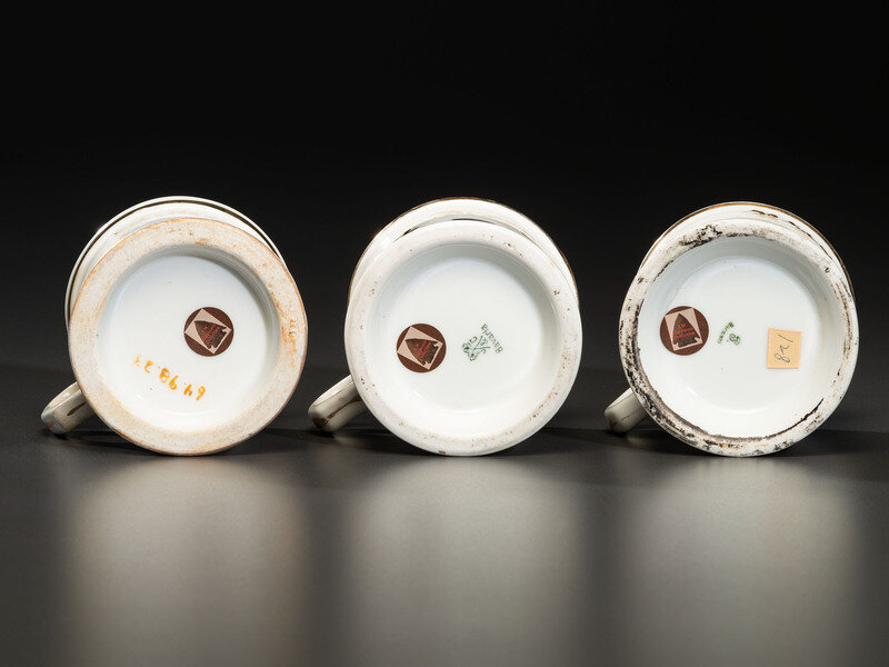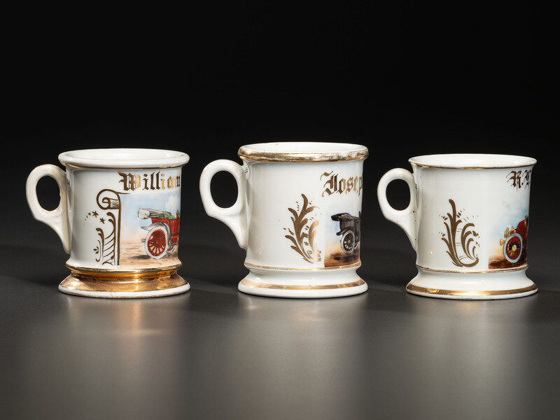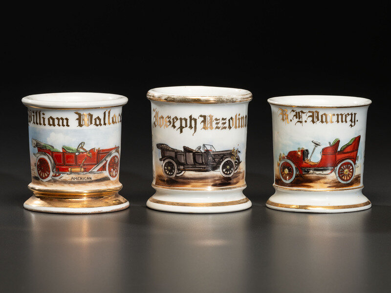 Three Porcelain Shaving Mugs Depicting Automobiles