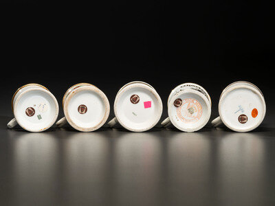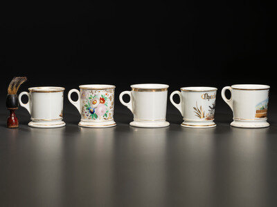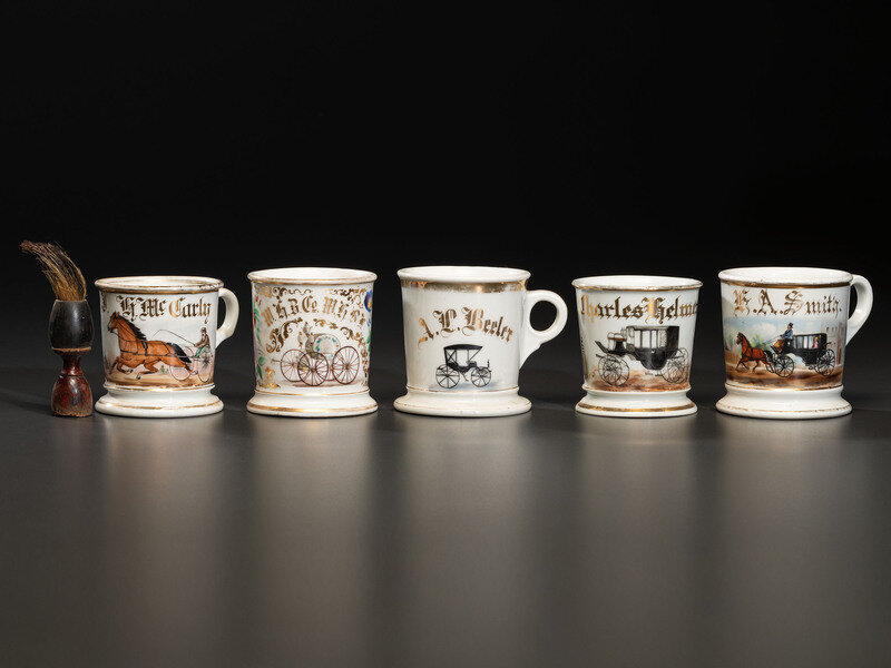 Five Porcelain Occupational Shaving Mugs Depicting Buggies and Carriages