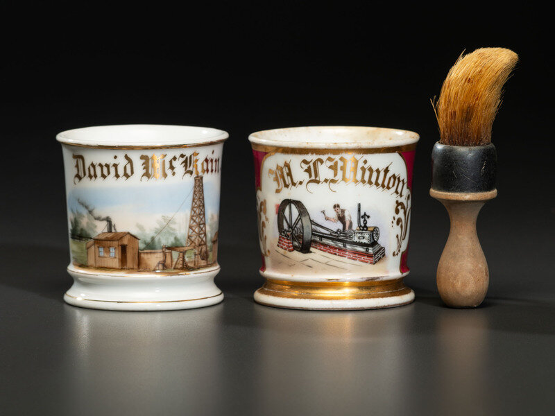 comprising a machinist's mug identified M.T. Minton in gilt lettering set against maroon wrap and an oilman's mug identified David McKain in gilt lettering and depicting a derrick drilling rig in a forested scene.