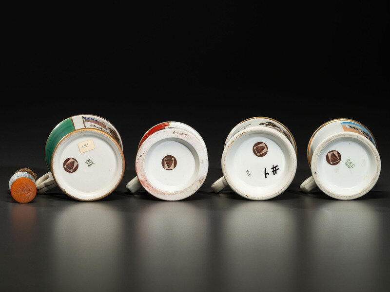 comprising a tinsmith's mug identified M. Padorsky in gilt lettering, a mug identified John Bruke depicting a soldier with American and Irish flags, a mug depicting a woman and the name W.G. Childes, and a mug identified John Stewart depicting the state seal of Pennsylvania.