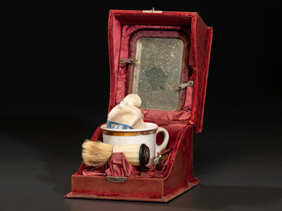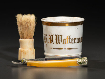 having a fitted interior housing a porcelain shaving mug identified G. V. Watterman in gilt lettering, a horn-handled shaving brush, a razor cloth, a mirror, and a German straight razor marked S. R. Droescher.