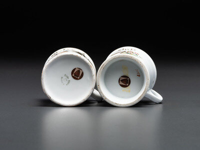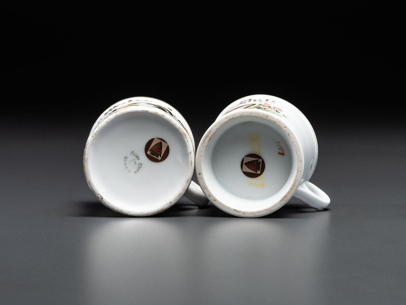one example depicting a painter's palette, bearing the name Oscar Weiss and marked for Felda China on underside; the other depicting a seascape canvas and bearing the name Charles McDuff.