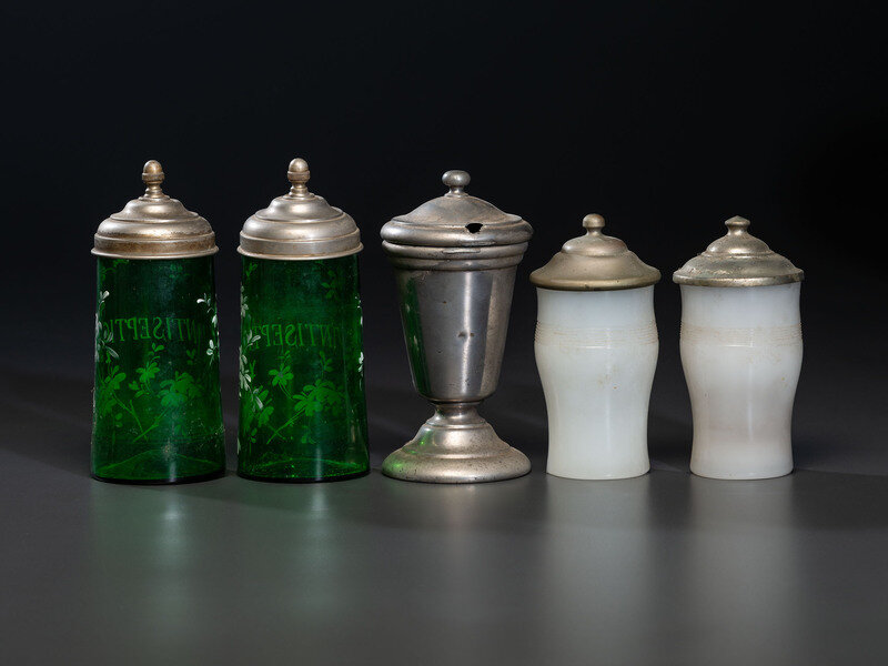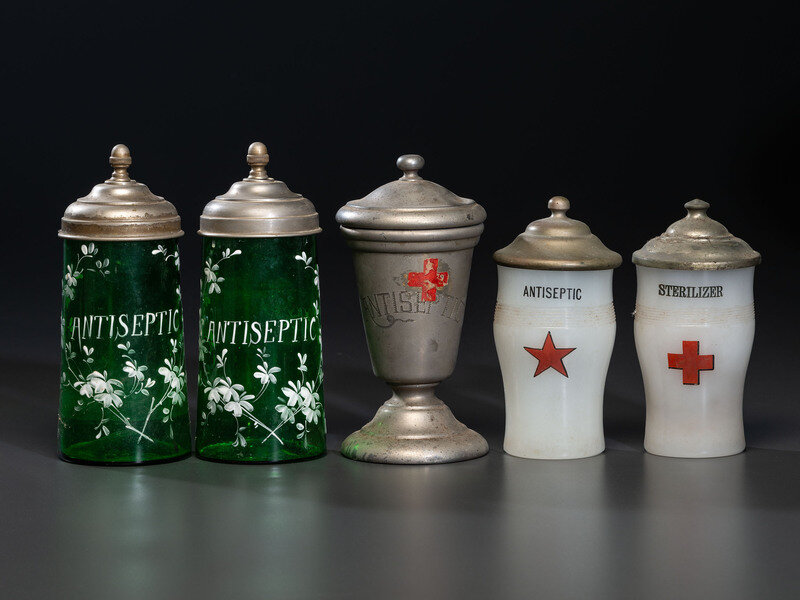 comprising two milk glass examples, two handpainted green glass examples, and a nickel-plated footed antiseptic jar identified to the Walters Barbershop in Easton, Pennsylvania.