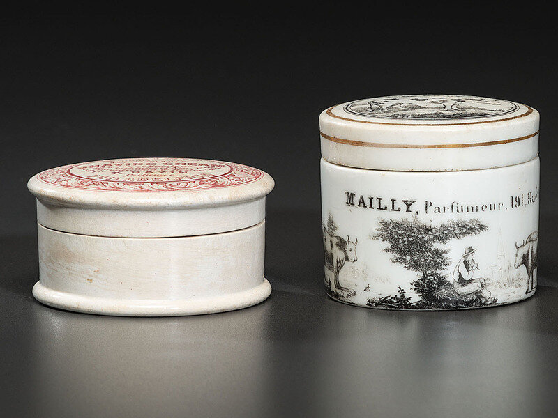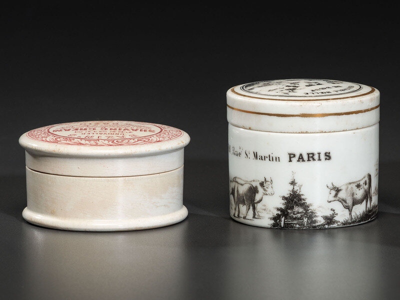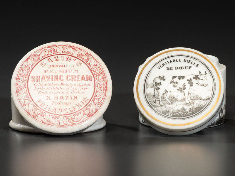comprising an example for shaving cream identified to soap maker and parfumier Xavier Bazin of Philadelphia, Pennsylvania and an example for beef tallow pomade identified to parfumier Louis Mailly of Paris, the lid depicting a standing spotted bull and the base depicting a bull and seated figure within a landscape.