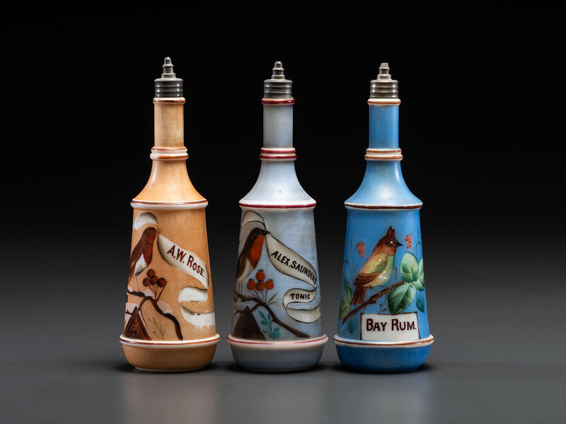 comprising one example labeled Alex Saunders / Tonic, one A.W. Rose, and one Bay Rum, each with bird decoration.
