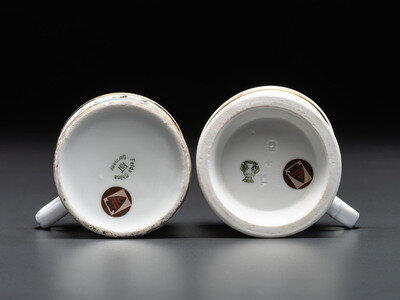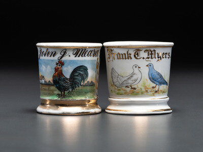 including one mug depicting a rooster, likely for a farmer, with the name John J. Meara, and a mug depicting two pigeons or doves, with the name Frank C. Myers.