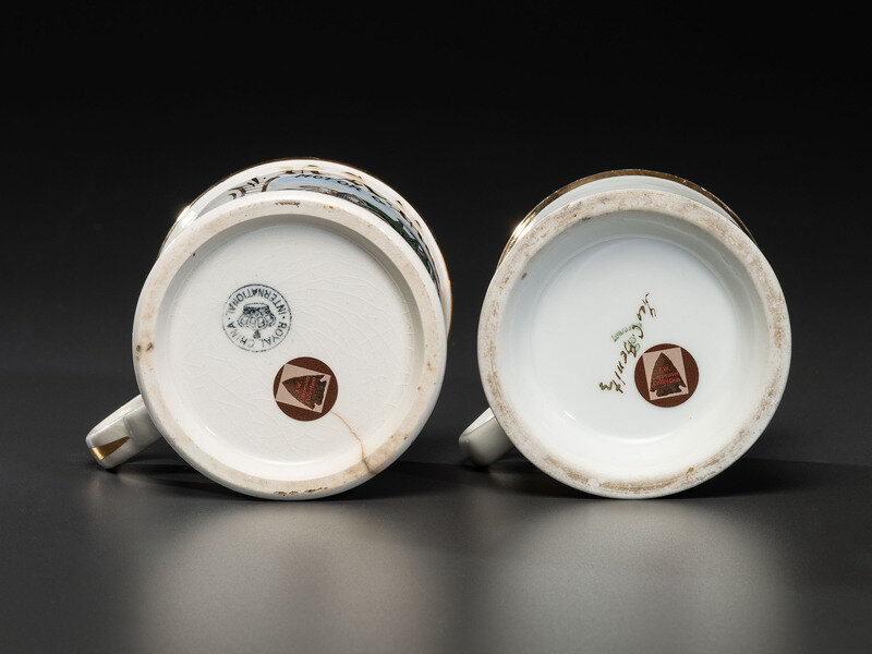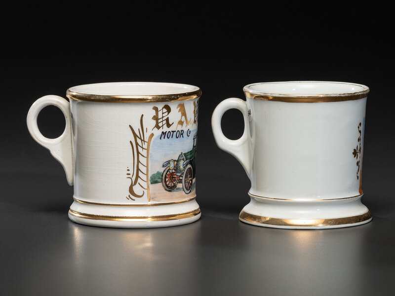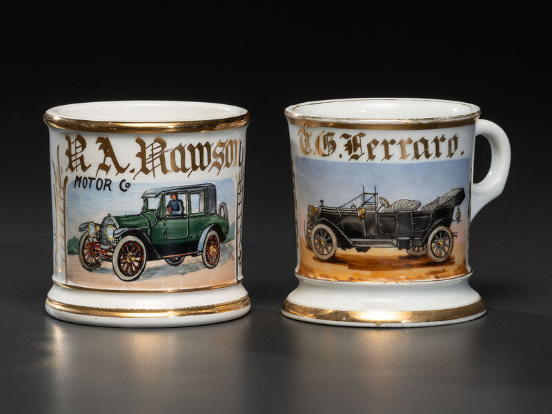 Two Shaving Mugs Depicting an Open Touring Automobile and a Coupe