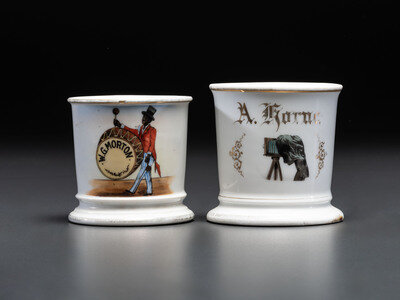 including a photographer's mug identified A. Korne in gilt lettering, and a drummer's mug with the name W.G. Morton present to drum face.