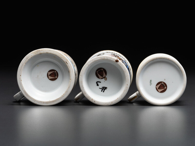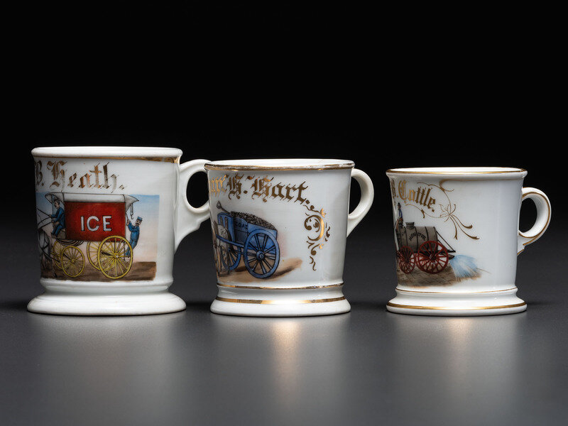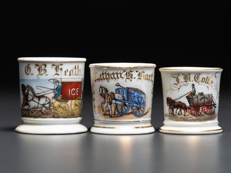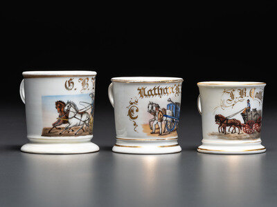Three Horse-Drawn Delivery Wagon Porcelain Occupational Shaving Mugs