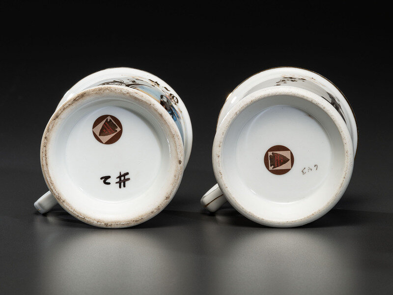 comprising a cobbler's mug identified E. Clarke depicting a gentleman standing next to a shoe, and a tailor's mug identified J.P. Bennett depicting the measurement of a gentleman for a fitting.