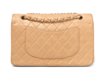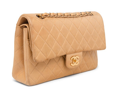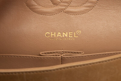 Chanel Medium Classic Double-Flap Shoulder Bag in Quilted Tan Lambskin with 24K Gold-Plated Hardware. CC Turn-Lock Closure and Interwoven Leather-Metal Chain.