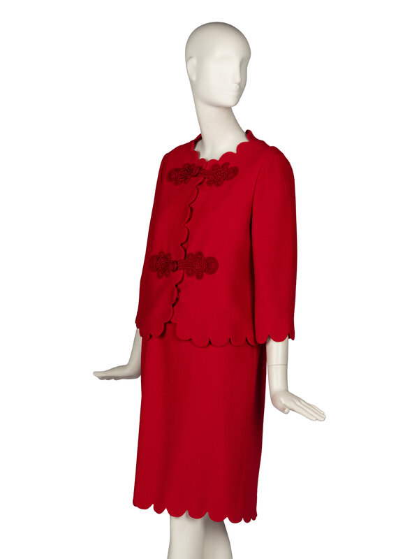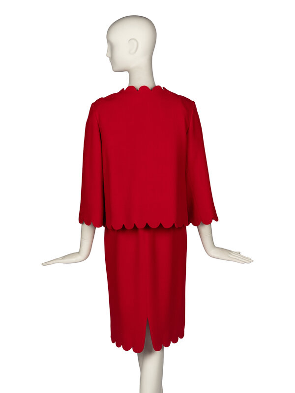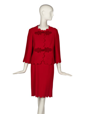 Scalloped-edge 3/4-sleeve collarless jacket in red wool crepe. Embroidered trim and buttons. Concealed snap closures.