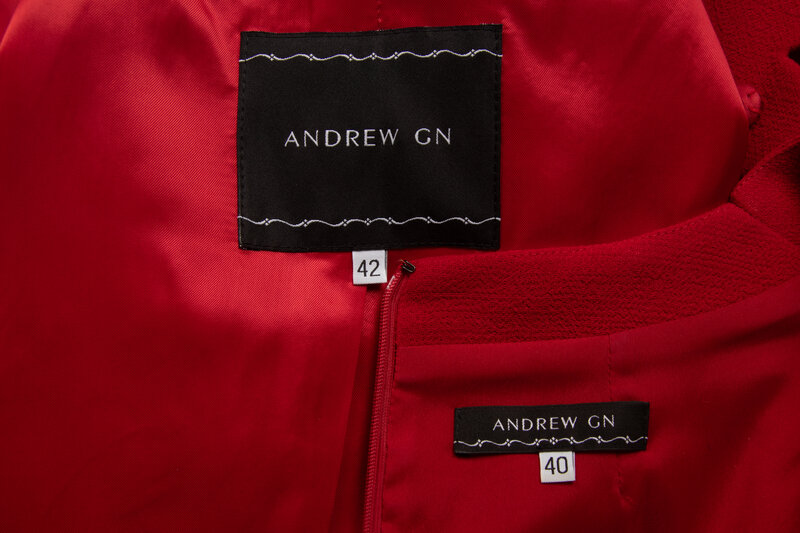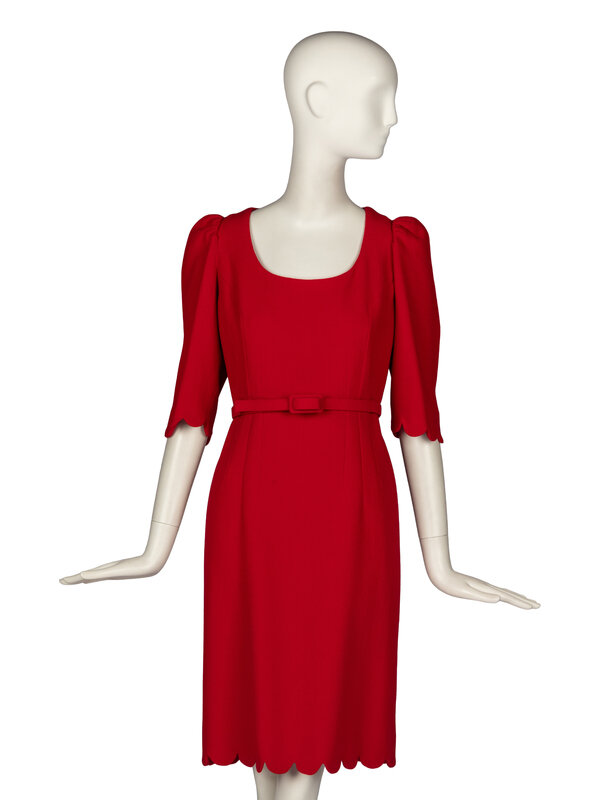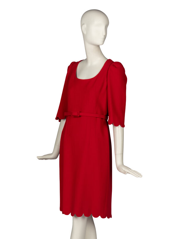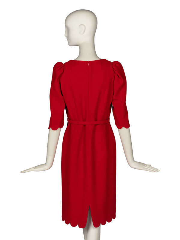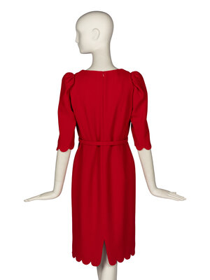 Mid-length dress in red wool crepe. 3/4 sleeve with gathered shoulder and scalloped-edge cuff. Scalloped-edge hem. Darts. Back vent. Back zip closure. Detachable matching belt.