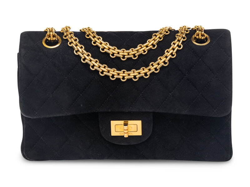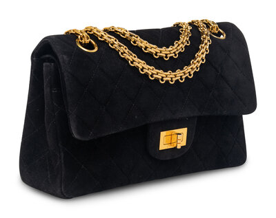 Chanel 2.55 Double-Flap Shoulder Bag in Quilted Black Suede with 24K Gold-Plated Metal Hardware. Mademoiselle Turn-Lock Closure and Metal Chain Strap.