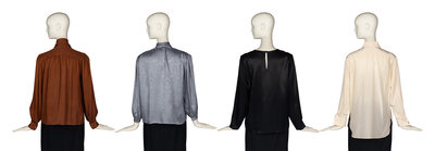 Black pullover blouse with round neck and shoulder pads. Single button closure at back.