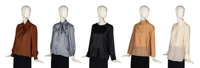 Cream silk blouse with starched collar and cuffs. Shell buttons. Gathered sleeves. French cuffs.