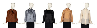 Pussy-bow blouse in light greyish-blue silk jacquard. Gathered sleeves. Shoulder pads. Asymmetric front hem. Single button closure at neck.