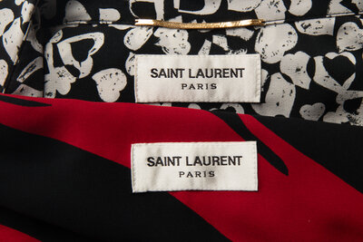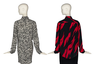 Shirt dress in black-and-white printed silk depicting hearts. Gathering at waist.