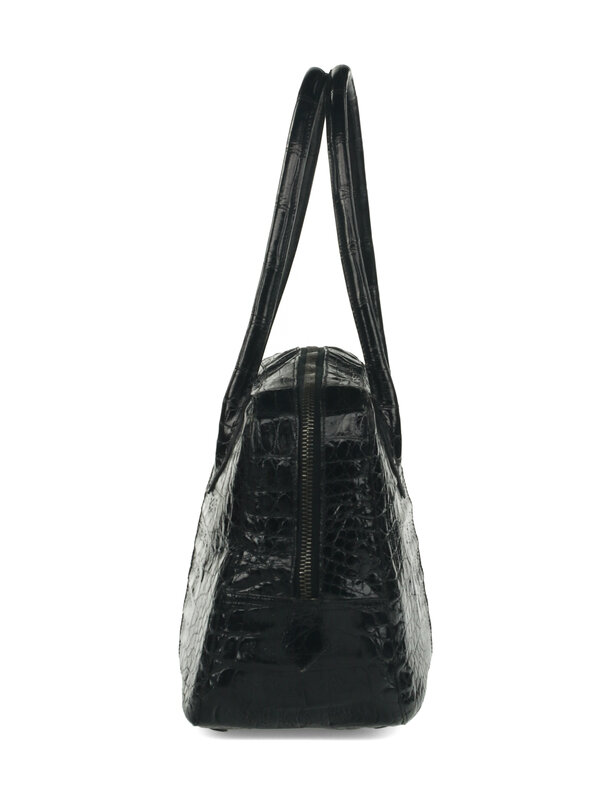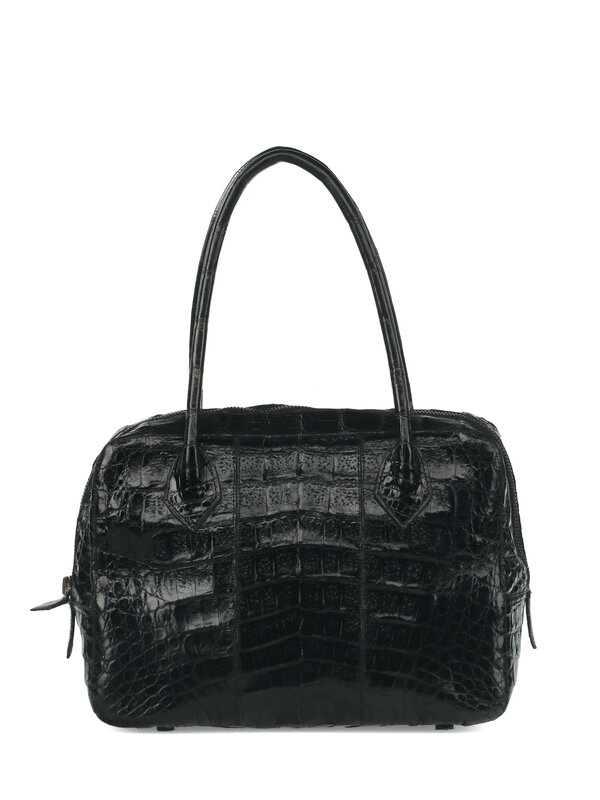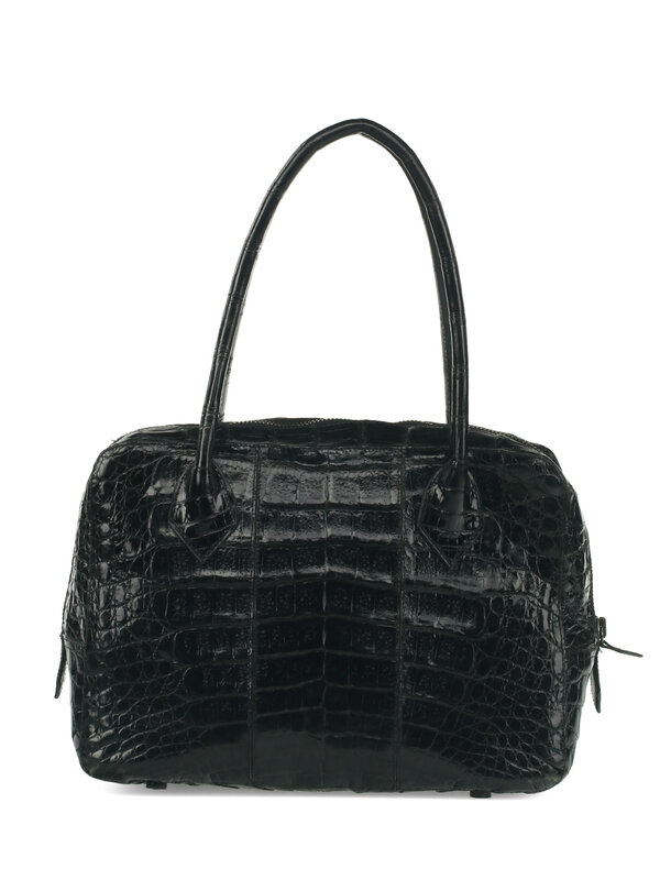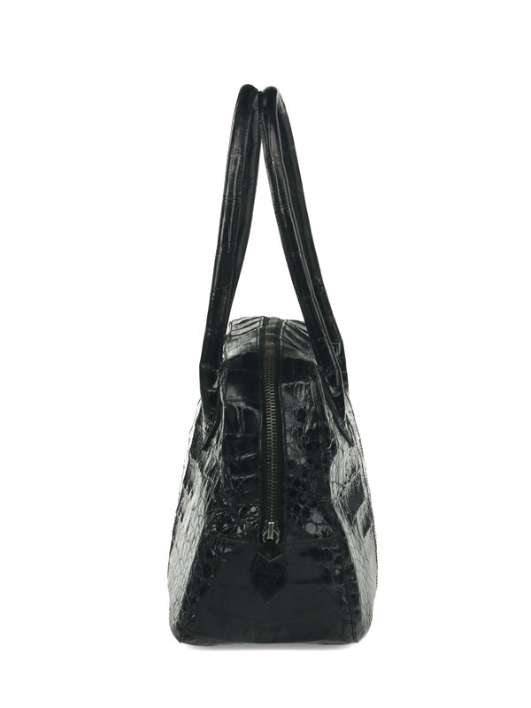 Nancy Gonzalez Black Crocodile Handbag with Aged Silver-Tone Hardware. Zipper Closure and Top Handles.