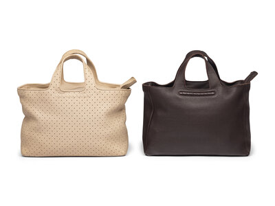 Bottega Veneta Beige Perforated Leather Tote with Zipper Closure.