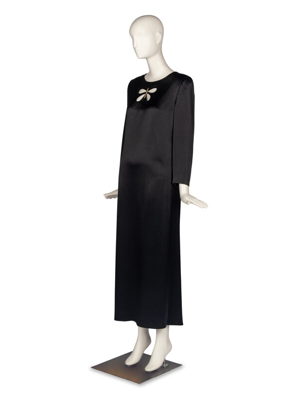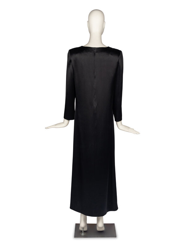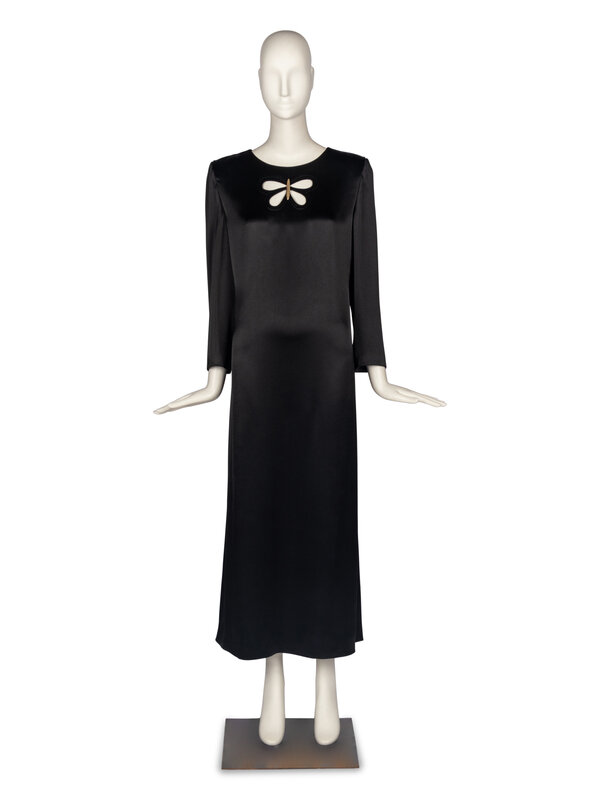 Black satin gown with butterfly-shaped cutout at chest and brushed gold-tone metallic accent. Long sleeve, straight silhouette. Shoulder pads. Partially lined. Back zip closure.