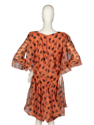Long-sleeve polka dot-print dress with draped chiffon layers. Bateau neckline. Shoulder pads. Back zip closure. Partially lined, sleeves are unlined and slightly sheer.
