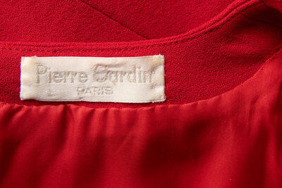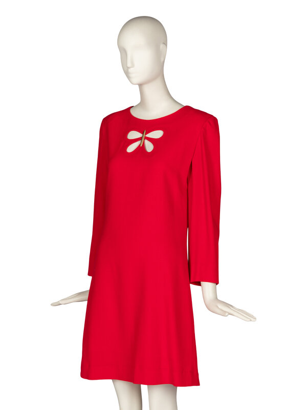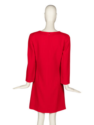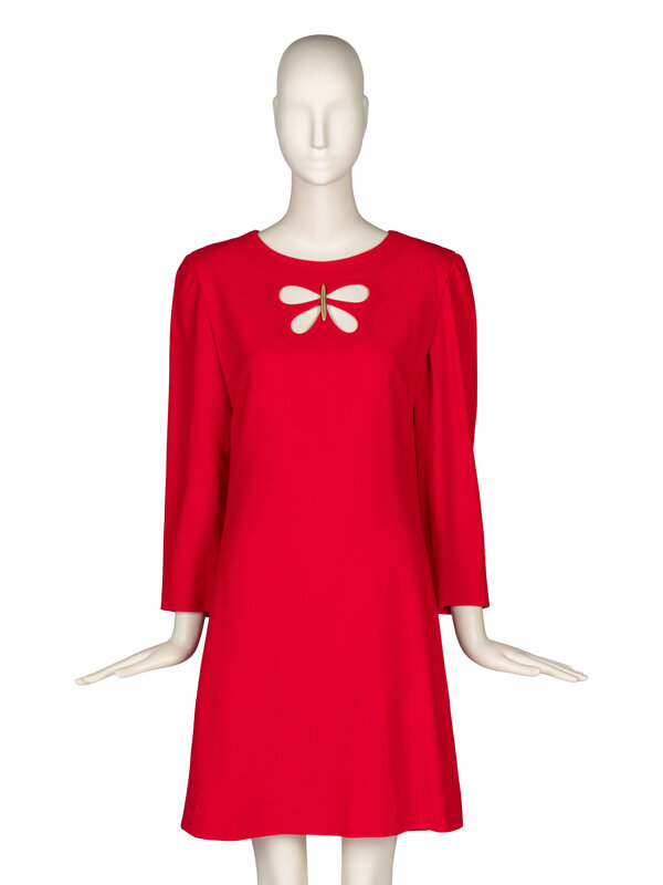 Long-sleeve shift dress in red crepe featuring a butterfly-shaped cutout with brushed gold-tone metal accent. Shoulder pads. Partially lined. Back zip closure.