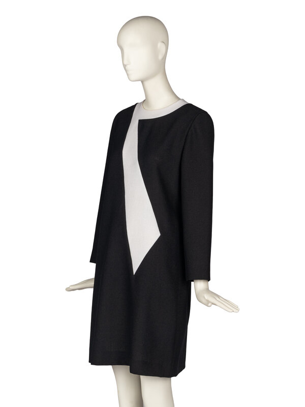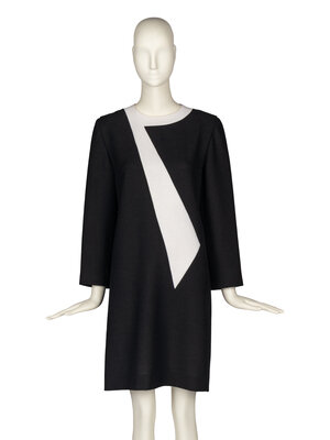 Long-sleeve shift dress in black with white geometric color-blocking. Shoulder pads. Unlined. Back zip closure