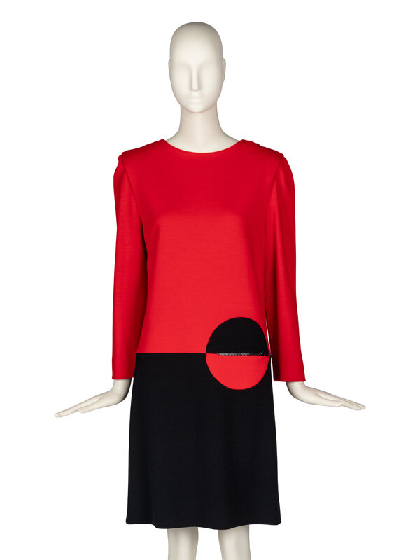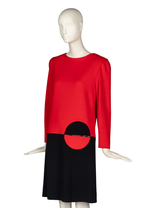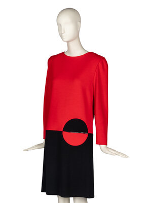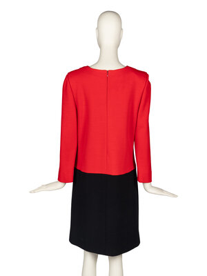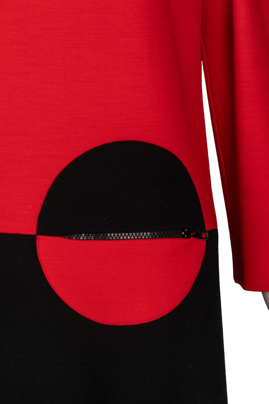 Long-sleeve shift dress in color-blocked red and black knit. Color-blocked circle features a zippered pocket. Shoulder pads. Partially lined. Back zip closure.