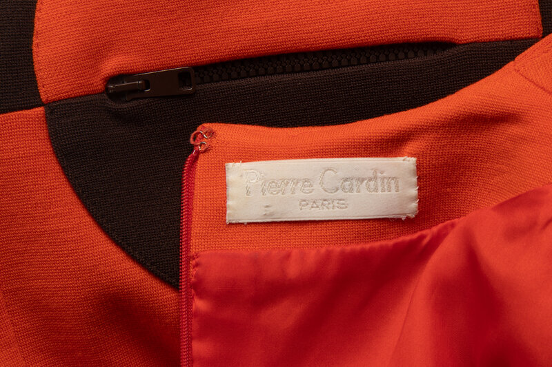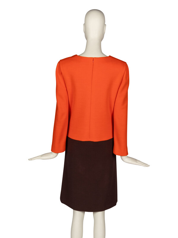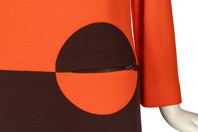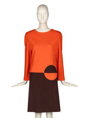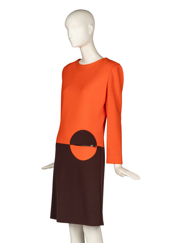 Long-sleeve shift dress in color-blocked orange and brown knit. Color-blocked circle features a zippered pocket. Shoulder pads. Partially lined. Back zip closure.