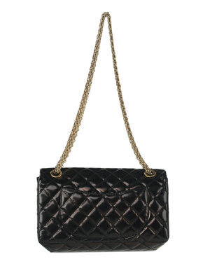 Chanel Medium 2.55 Reissue Shoulder Bag in Quilted Black Patent Leather with Gold-Tone Hardware. Mademoiselle Turn-Lock Closure and Metal Chain Strap.