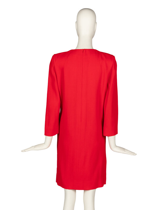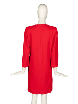 Red long-sleeve shift dress. Wrap-effect front with sewn-on black vinyl accents. Shoulder pads. Partially lined. Back zip closure