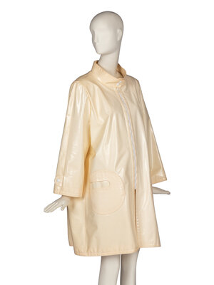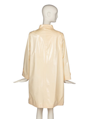Mid-length cream vinyl raincoat with stand collar. Abstract circular front patch pockets. Front zip closure with snaps at collar. Fully lined.