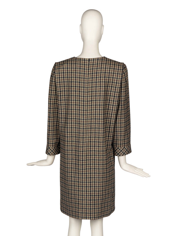 Long-sleeve shift dress in plaid wool. Decorative pocket flaps at hip. Leather tie at front waist. Shoulder pads. Partially lined. Back zip closure.