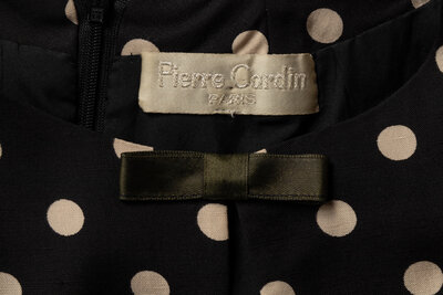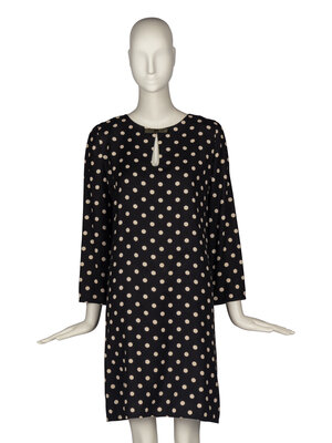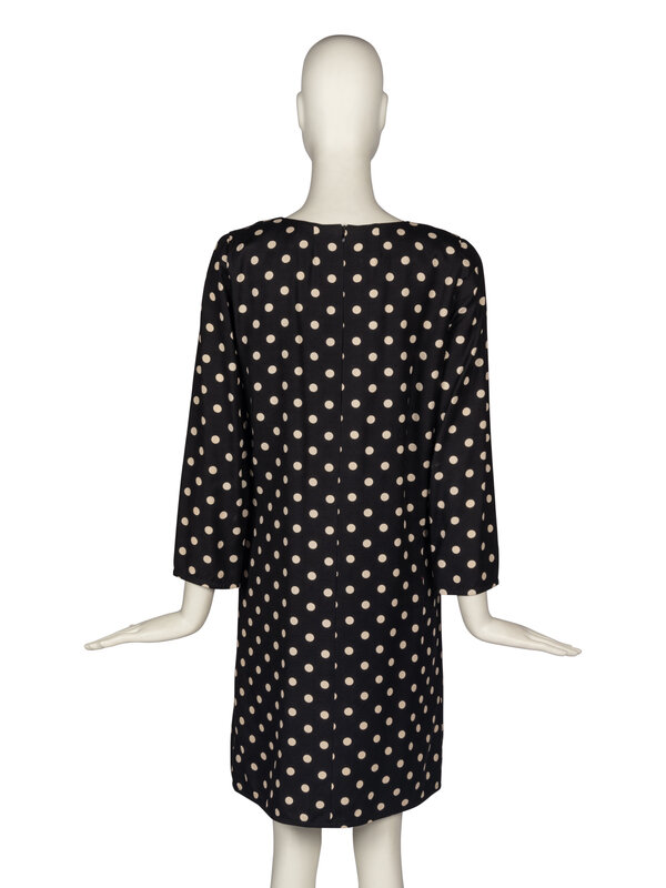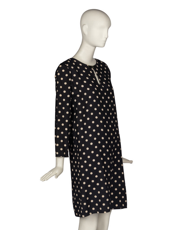 Long-sleeve shift dress in navy blue with polka dots. Keyhole cutout and satin bow accent at neckline. Lined. Back zip closure.