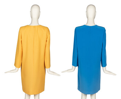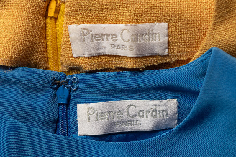 Long-sleeve shift dress in mustard yellow. Paneled front construction. Two front pockets with tack stitching. Shoulder pads. Unlined. Rear zip closure.