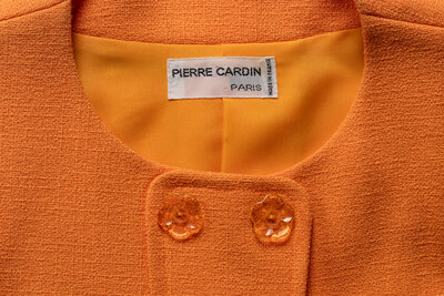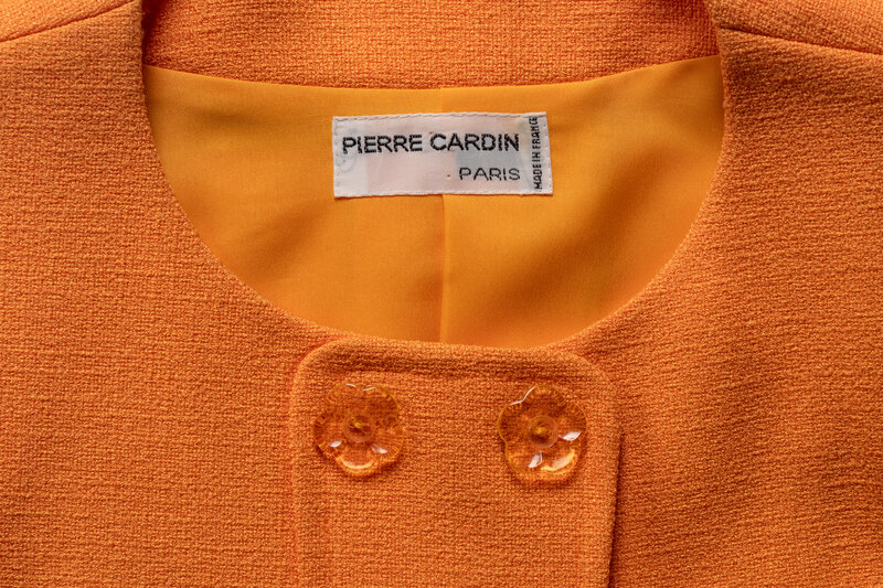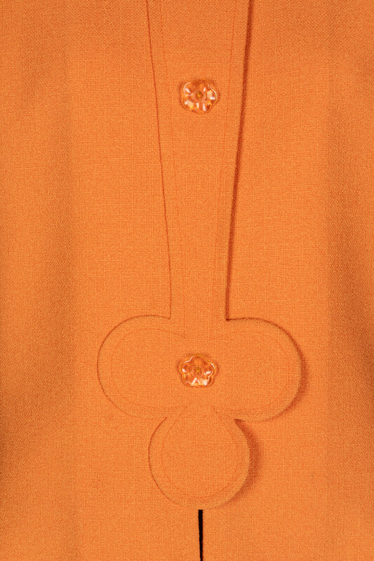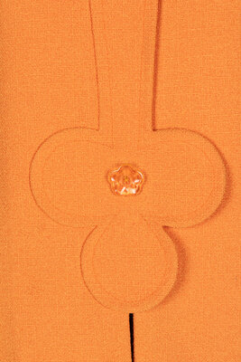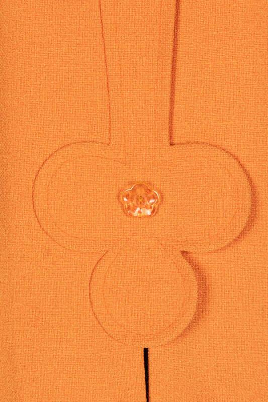 Orange collarless jacket with an abstract-shape front panel. Flower-shaped decorative buttons, Shoulder pads. Snap closures. Lined. This jacket is ready-to-wear, whereas the other two in this lot are haute couture.