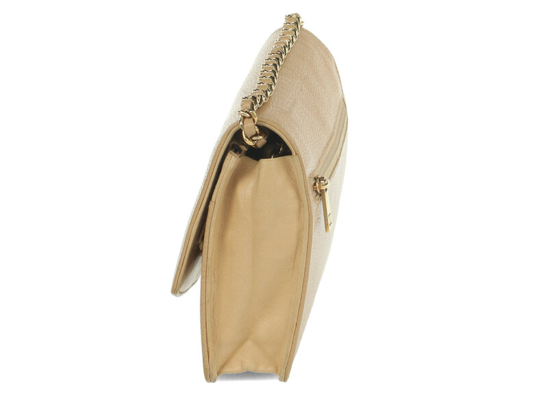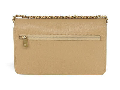 Chanel Timeless Wallet-On-Chain in Tan Caviar Leather with Gold-Tone Metal Hardware. Snap Closure and Interwoven Leather-Metal Chain.